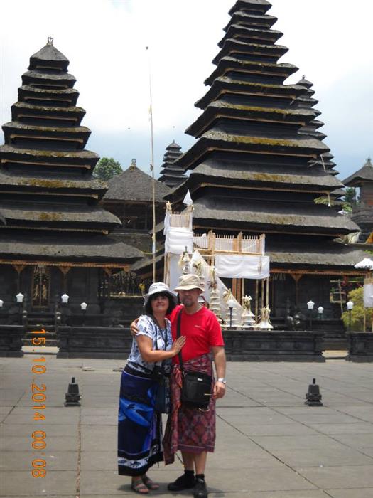 Dupa micul dejun luat pe terasa restaurantului de pe malul Oceanului Indian, (a carui valuri faceau un spectacol grozav), am plecat apoi spre Lovina (din est in nord). Pe drum am vizitat baia regala-superba Tirta Gangga, bazine cu statui, cu o gradina luxurianta, cu nuferi, cu lotusi, etc., apoi am vazut cel mai mare, cel mai vechi si cel mai sfant templu hindus din Bali - templul Mama-Besakih, vulcanul activ Batur (3000 m) si lacul Batur, si inca unul de peste 2000 m Gunung Agung si un alt templu, Maduwe Karang. Pranzul l-am luat pe terasa unui restaurant spectaculos, in stilul inside-out, situat pe un deal si de unde se vedeau in vale terase cu orez si dincolo de ele vulcanul Batur, cu varful invaluit in nori. Panorama iti taia rasuflarea. Cand am iesit din restaurant, surpriza! chiar langa usa pe o creanga era un liliac mare cat un catel, cu capul in jos si misca necontenit din aripi. Mister Wi ne-a explicat ca este un fruit bat (ptr. ca se hraneste cu fructe) si se mai numeste si vulpe zburatoare si ca este pet-ul unui angajat al restaurantului, fiind crescut de acesta de mic si domesticit. Hotelul Aneka din Lovina e la fel de confortabil si de plin de vegetatie si are oceanul cald ca ceaiul (am facut o baie, in sfarsit!), plaja era neagra, cu nisip vulcanic, plina de barci specifice, care sa te duca in larg la snokeling, sau dimineata devreme sa vezi delfinii, (chestii pe care le-am sarit). Cand am iesit din apa, doua localnice faceau masaj pe mal, pe mese de masaj puse pe nisip si ne-au imbiat si pe noi. Pretul era sub o treime din cel din Romania, asa ca ne-am regalat cu cate un masaj balinez de o ora.